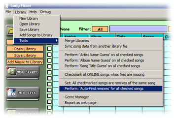 | Select this menu item to let Song Mixer look for remixes. It will look for songs with matching titles, or songs who's artist & titles are similar. Be sure to review what it has done before you save your library |