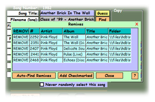Click "Auto-Find Remixes", and this will use the same method as before to locate possible remixes, however in this case it will only affect this song and any remixes it finds rather than every song in the library. You will now be able to remove any that are not true remixes. If you click "Add Checkmarked" then any songs on the main list that are checked will be added as remixes of this song. NOTE:Doing this will checkmark this song as well, even if no other songs are checkmarked. |